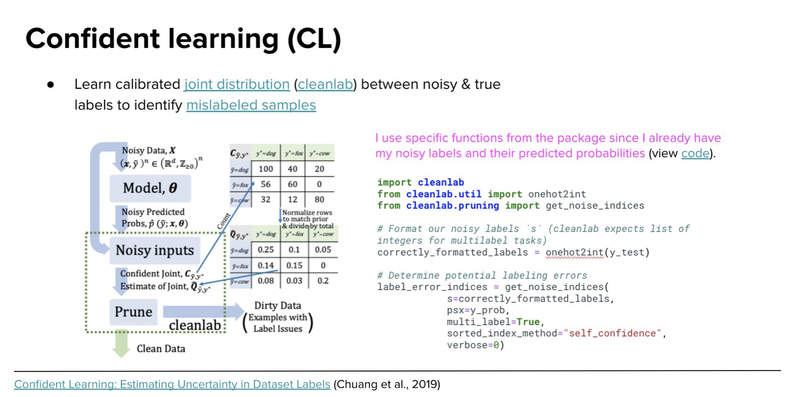 Find label issues with confident learning for NLP Estimate noisy labels We use the Python package cleanlab which leverages confident learning to find label errors in datasets and for learning with noisy labels. Its called cleanlab because it CLEAN s LAB els. cleanlab is: fast - Single-shot, non-iterative, parallelized algorithms