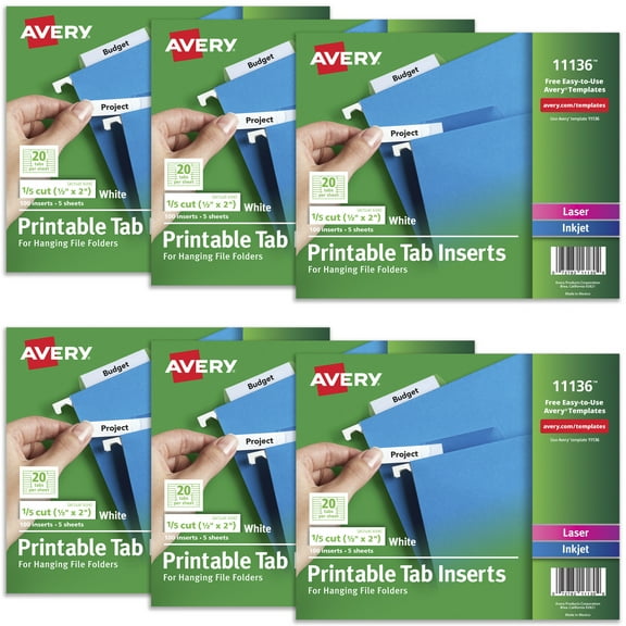 Avery 11136 Printable Inserts for Hanging File Folders, 1/5 Tab, Two, White, 100/Pack